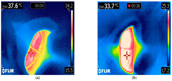 A 21-year-old male killer whale living at Facility B, weighing 3672 kg, presented with decreased appetite and resting at the bottom of the pool. Veterinary physical exam was performed on the same day as clinical signs were reported. Infrared thermography of the oral mucosa revealed an increase in surface temperature at the lower right eighth tooth, which had associated periapical lucency on voluntary dental radiographs. The animal was asked by husbandry staff to rest in ventral recumbency at the surface of the water and breathe normally while a handheld infrared camera (the same model as in Facility A) was held directly above the blowhole at a distance of approximately 2 ft (0.61 m), as previously described [17]. The camera was calibrated using melting ice at 0 °C prior to examination. Blowhole temperature was 36.4 °C on the day of presentation (Figure 3a). The animal was then asked by trainers to rest by the side of the pool in dorsal recumbency for insertion of a rectal temperature probe to 40 cm depth. Rectal temperature was 37.4 °C. A blood sample collected the same day from the ventral fluke PAVR revealed decreased ALP (69 IU/L, down from 100 IU/L), markedly elevated ESR (23 mm/h; 0 mm/h is typical for the species) and fibrinogen (608 mg/dL, up from 265 mg/dL), globulin (4.4 g/dL, up from 3.7 g/dL), decreased iron (23 µg/dL, down from 75 µg/dL), and leukocytosis (9.46 × 103/µL characterized by an 86% neutrophilia, up from 6.08 × 103/µL). These changes are consistent with a systemic inflammatory response, are outside of the available reference intervals for this species [17,30,31], and were notably changed from a routine sample collected one week prior to presentation. This animal was diagnosed with a periapical tooth abscess and a dental extraction was subsequently performed. The animal responded well to antimicrobial therapy and analgesia (clindamycin 4.5 mg/kg PO q 12 h, voriconazole 0.27 mg/kg PO q 24 h, and aspirin 240 grain equine bolus total dose PO once). Rectal and blowhole temperatures returned to 35.5 °C and 33.6 °C, respectively, within one week of initiating treatment (Figure 3b). Normalization of CBC, serum biochemistry, ESR, and fibrinogen followed dental extraction performed 14 days later.