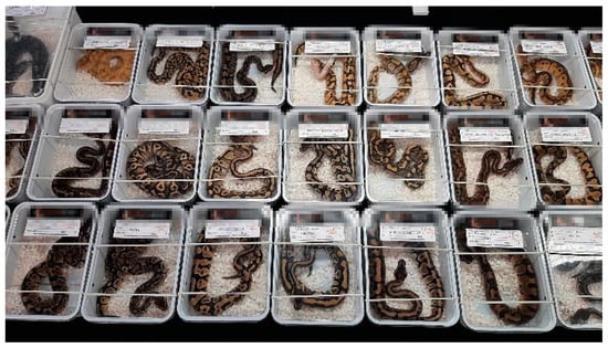 - Hollandt, T.; Baur, M.; Wöhr, A.C. Animal-appropriate housing of ball pythons (Python regius)—Behavior-based evaluation of two types of housing systems. PLoS ONE 2021, 16, e0247082. [Google Scholar] [CrossRef]