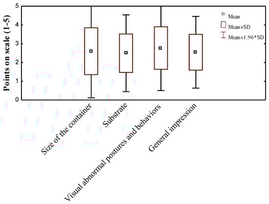 The results of the evaluations carried out by the testers of the exhibition containers in terms of characteristics related to animal presentation (size of the container and substrate), the presence of visible signs of abnormal behavior, and the general impression of the level of animal welfare in the container are summarized. Testers, given a five-point scale, rated the size of the containers used in which the animals were offered at 2.60 points (±0.009), the type and amount of substrate used at 2.49 (±0.007), and undesirable behavior at 2.77 (±0.008) (Figure 2). Their overall impression of how the animals were presented and their feelings about their welfare averaged 2.54 points (±0.007).