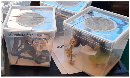 All vertebrates offered must be displayed in opaque containers with transparent lids. Presumably, this prevents stressing out animals exhibited next to each other and creates a small, safe space for animals [36,40,41,42,43,44]. Aquatic species must be exhibited in aquariums, and wetlands species must be provided with suitably high humidity [41,42]. All vertebrates must be housed separately during fairs. The size of the container and given spaces should provide animals with the ability to stretch. In places where fairs occur, the temperature should be suitable for most exotic pets, but as observed, it depends heavily on the time of year. It might be too cold during autumn, winter, and spring, even considering the short exposure time. If necessary, the vendor must provide a suitable temperature by heating the tables [37,42].