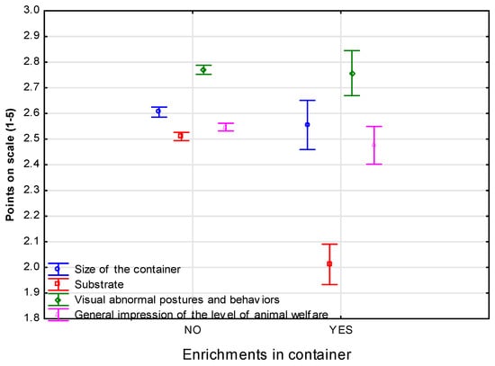 Figure 4 shows how containers were rated depending on whether they were equipped with environmental enrichment or not. Interestingly, the presence of environmental enrichments in the containers did not cause them to receive higher scores during evaluation (Figure 4). The differences between the mean scores of the containers in terms of the presence of enrichments in them were statistically significantly different (F(4, 17,173) = 37.87, p < 0.001).