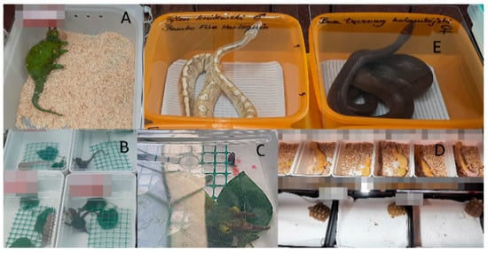Examples of incorrect ways of presenting reptiles for sale at the examined fair (the breeders’ name was blurred on the photo). (A–C)—chameleons presented in horizontal containers: (A) Triceros jacksonii without environmental enrichment and with unsuitable substrate; (B) Furcifer pardalis had enrichment (for climbing) but flat container prevented them from climbing; paper towel is used as substrate; (C) Triceros jacksonii had enrichment; paper towel used as substrate; visibly bloody droppings, suggesting health problems. (D) Upper containers: Eublepharis macularius had insufficient substrate and cramped container; bottom container: Centrochelys sulcata, proper container size but inadequate substrate; (E) Python regius and Epicrates cenchria maurus kept in small containers, with inappropriate substrate and covered with an acrylic lid without any ventilation holes; snakes directed their nostrils to the micro-gap at the junction of the lid with the container, and it was suspected that there were was little air in the container.