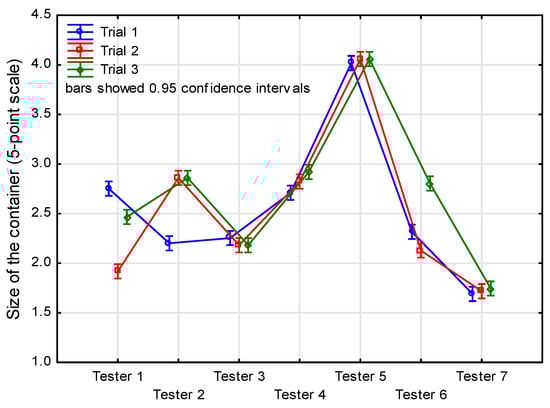 A two-way ANOVA showed a significant difference between testers considering successive repetitions (tester*trial: F(48, 66,081) = 70.70, p < 0.001) (Table 3). Correlation coefficients examining the repeatability of individual testers are shown in Table 3. In assessing container size, tester No. 6 had the highest intra-rater reliability (mean r = 0.95), and tester No. 4 had the lowest (mean r = 0.75). Significant differences in the ratings were noted for visual abnormal postures and behavior, and the average correlation coefficient obtained ranged from 0.64 to 0.98.