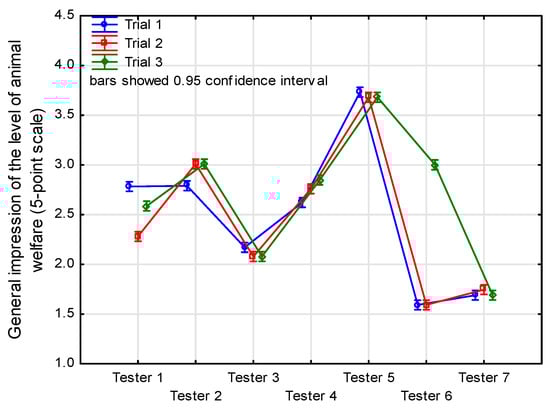 Result of general impression of the level of animal welfare according to tester and trial number.