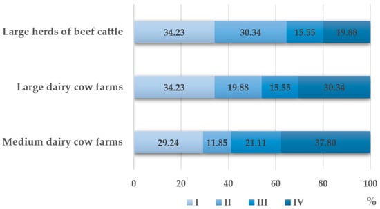 Table 2 shows the average antibiotic usage over a 4-year period between individual farms. The highest (p < 0.01) annual antibiotic usage was found in large dairy farms (mean 18.29), while the lowest usage was recorded in medium dairy farms and beef herds. In all types of herds, the largest (p < 0.01) quantities of antibiotics in mg·PCU−1 were used to treat general diseases. Restrict antibiotics (3 = third- and fourth-generation cephalosporins, polymyxins—colistin and polymyxin B, and fluoroquinolones) were used in the largest amounts (p < 0.01) in large dairy herds. The quantity of restrict antibiotics used there was about 5 times greater than in beef herds or medium dairy farms, with most of their use related to general treatment (Table 2). In large dairy herds, the most significant amounts (p < 0.05) of category D antibiotics were used to treat mastitis during lactation, while in medium dairy farms, category D antibiotics were predominant for this treatment. Statistically significant differences (p < 0.01) of restrict antibiotics were used for dry cow therapy more in large dairy farms compared to medium dairy farms. In dairy farms, 100% of antibiotic use was for general treatment.