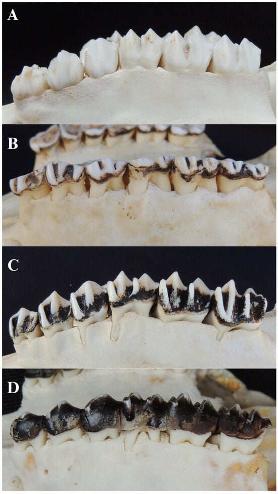 Different degrees of dental calculus in right maxillary premolars and molars. (A) Grade 0 dental calculus in an eight-year-old female Mazama americana. (B) Grade 1 dental calculus in a female M. americana. (C) Grade 2 dental calculus in a female Blastocerus dichotomus. (D) Grade 3 dental calculus in a female M. chunyi.