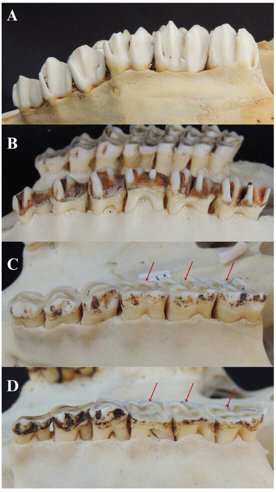 In the present study, a high prevalence of tooth wear (71.1%) was observed in the animals evaluated. Evidence suggests that cervids with high rates of tooth wear experience reduced survival, reproductive performance, mass, and body condition [11,12,13]. Tooth wear has been mainly associated with dentin exposure and is considered a pathological process when this occurs [29,30]. Furthermore, no significant differences were found in the prevalence of wear between the mandibular and maxillary teeth of the animals evaluated, which shows that tooth wear occurs in all groups of teeth.