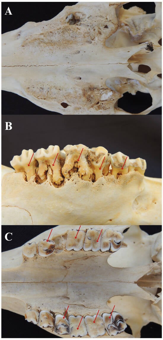 (A) Absence of all maxillary teeth in a 15-year-old male Mazama americana. (B) Non-functional left maxillary second and third premolar teeth and all molars highlighted by the red arrow of a ten-year-old female Blastocerus dichotomus. (C) Presence of tooth fracture in a female Passalites nemorivagus in the maxillary teeth: second premolar, first and second left molars, third premolar, and right molars highlighted by the red arrow.