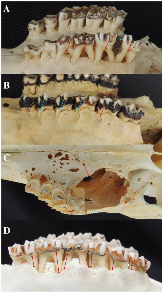 Consequently, the general health of ruminants is directly related to digestive efficiency, and teeth and periodontium alterations can have significant adverse effects [10]. Studies evaluating in situ roe deer (Capreolus capreolus) and moose (Alces alces) oral health indicated that molar teeth deterioration was associated with a decline in survival and reproductive performance in aged animals [11,12,13]. Among various oral conditions, periodontal disease is a significant concern in veterinary medicine as it affects the periodontium and triggers an immunoinflammatory response, exacerbated by oral microbiota imbalance, leading to irreversible consequences and eventual tooth loss [14,15,16].