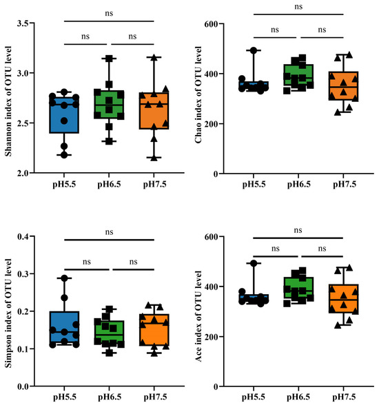 α-diversity of T. s. elegans in different pH groups. α-diversity by Shannon, Chao, Simpson, and Ace was tested for significance using the Kruskal–Wallis rank-sum test. p-values indicate the confidence level of statistical analyses, with p < 0.05 indicating significant differences. ns indicates nonsignificant differences.