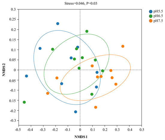 β-diversity analysis was performed using the NMDS analysis plot based on weighted UniFrac distances. The gut flora of T. s. elegans overlapped but also differed across pH groups, and the differences were significant (p = 0.03, Figure 2).