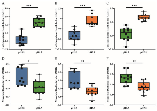 Comparative analysis of GMHI and MDI in T. s. elegans across different pH levels. (A) GMHI comparison between T. s. elegans exposed to pH 5.5 and pH 6.5 environments. (B) GMHI comparison between T. s. elegans exposed to pH 5.5 and pH 7.5 environments. (C) GMHI comparison between T. s. elegans exposed to pH 6.5 and pH 7.5 environments. (D) MDI comparison between T. s. elegans exposed to pH 5.5 and pH 6.5 environments. (E) MDI comparison between T. s. elegans exposed to pH 5.5 and pH 7.5 environments. (F) MDI comparison between T. s. elegans exposed to pH 6.5 and pH 7.5 environments. p-values indicate the confidence level of statistical analyses, with p < 0.05 indicating statistically significant differences. * represents p < 0.05, ** represents p < 0.01 and *** represents p < 0.001.