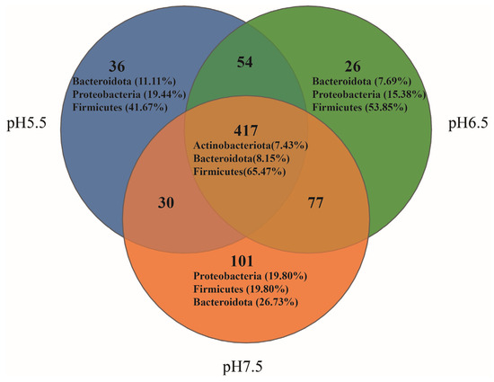 Venn diagrams illustrate the shared and distinct gut flora of T. s. elegans in different pH groups. In the gut flora, 741 OTUs were found, with 417 (56.28%) shared in different pH groups (Figure 4). Among these shared OTUs, 273 belonged to Firmicutes (65.47%), 34 to Bacteroidota (8.15%), and 31 to Actinobacteriota (7.43%). In the pH 5.5 group, 36 OTUs were identified as unique, comprising 4.86% of the total. Among these, 15 OTUs belonged to Firmicutes (41.67% unique), 7 to Proteobacteria (19.44% unique), and 4 to Bacteroidota (11.11% unique). In the pH 6.5 group, 26 OTUs were identified as unique, comprising 3.51% of the total. Among these, 14 OTUs belonged to Firmicutes (53.85% unique), 4 to Proteobacteria (15.38% unique), and 2 to Bacteroidota (7.69% unique). In the pH 7.5 group, 101 OTUs were identified as unique, comprising 13.63% of the total. Among these, 27 OTUs belonged to Bacteroidota (26.73% unique), 20 to Firmicutes (19.80% unique), and 20 to Proteobacteria (19.80% unique).