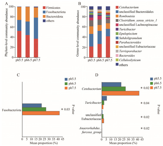 A comparative analysis of the gut flora of T. s. elegans in different pH groups at the phylum and genus level is presented. (A) illustrates the gut flora at the phylum level. (B) illustrates the gut flora at the genus level. (C) highlights significant differences in gut flora at the phylum level. (D) highlights significant differences in gut flora at the genus level. * represents p < 0.05.