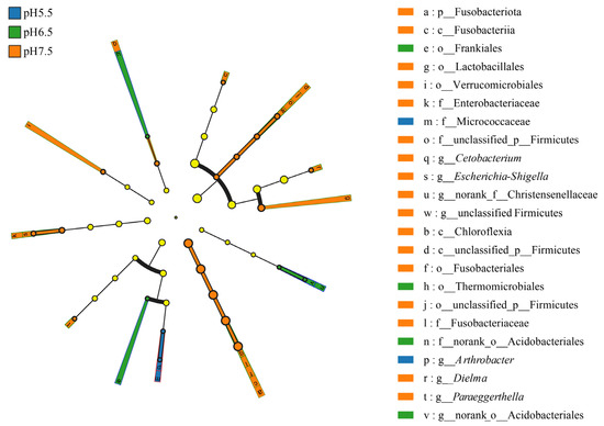 LEfSe analysis of gut flora markers in T. s. elegans in different pH groups. The diameter of each circle reflects its abundance. Multiclass analysis was flexible (at least one class difference). Inside-out circles reflect classification from phylum to genus. Inside-out circles symbolize the taxonomy from phylum to genus. Class, order, and family labels are displayed as well as all taxa with LDA scores > 2. The yellow color circles indicate no significant differences between the groups.