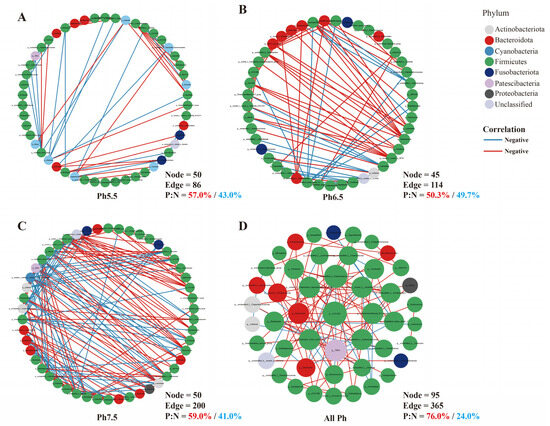Gut microbiota genus-level interaction network under pH. (A) pH 5.5 group; (B) pH 6.5 group; (C) pH 7.5 group; (D) all pH groups. Each node represents a bacterial genus. Node colors represent bacterial phylum. Blue edges represent negative correlations, while red edges represent positive correlations (|correlation| > 0.5, p < 0.05).