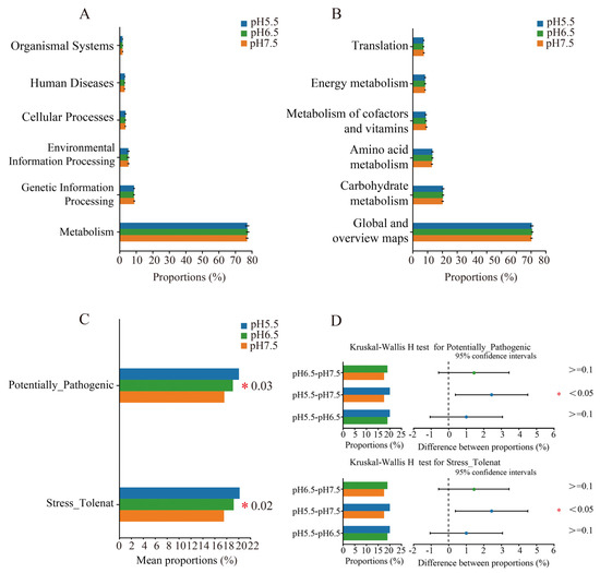 The microbiota in the guts of T. s. elegans in different pH groups exhibited several key functions, including metabolism, genetic information processing, environmental information processing, human diseases, cellular processes, and organismal systems (Figure 8A). T. s. elegans in different pH groups exhibited nonsignificant differences in global and overview maps, translation, carbohydrate, amino acid, energy, cofactor, and vitamin metabolisms (Kruskal–Wallis, p > 0.05) (Figure 8B). To clarify the differential changes in the gut flora of T. s. elegans in different pH groups, we employed the BugBase algorithm to analyze and predict bacterial phenotypes. This allowed us to explore significant differences in the functions and characteristics of the gut flora in different pH groups, focusing on traits such as Potentially_Pathogenic and Stress_Tolerant (Kruskal–Wallis, p < 0.05) (Figure 8C). In addition, the proportion of bacteria related to the Potentially_Pathogenic and Stress_Tolerant traits gradually increased with the pH drops, and there was a significant difference between the pH 5.5 group and pH 7.5 group (Figure 8D).
