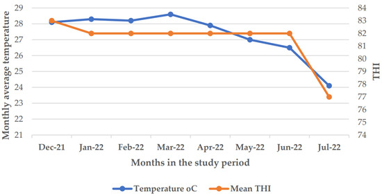 Average temperature (°C) and temperature—humidity index variation across the months of the study period.