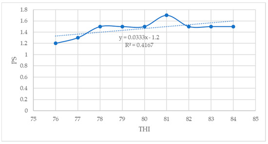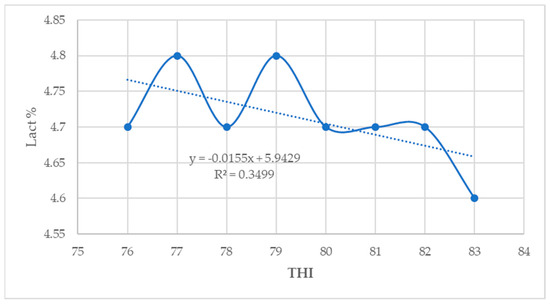 In this study, the milk yield and fat percentage showed a low positive association with THI (p < 0.05) (Figure 2 and Figure 3). However, the protein, lactose, and solids–not–fat percentage showed a low negative correlation with THI (p < 0.05) (Figure 4, Figure 5 and Figure 6).
