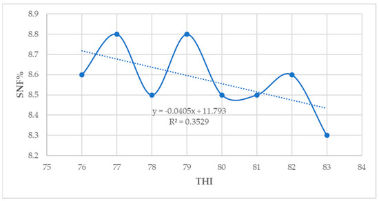 Relationship between THI and solids–not–fat percentage (p < 0.05).