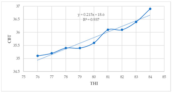 Studies have shown that an RR greater than 60 breaths/min indicates HS when dairy cow use evapotranspiration as the key mechanism for losing body temperature [51]. In the present study, when THI values increased from 76 to 84, the lactating Holstein Friesian crossbred dairy cows responded by increasing the RR. Also, when the THI values increased from 76 to 84, there was an increase of 0.4 °C for CBT and RT, and there were 11 breaths per min. Similar patterns of responses to HS were observed in the study conducted in Tunisia by Djelailia et al. [59]. In their study, HS altered RT, RR, and HR such that a daily increase of 1.2 °C was observed when the THI values increased from 55 to 78, while the HR and RR increased by 3 beats per min and 35 breaths per min, respectively. The physiological responses to HS observed in this study are an adaptive mechanism initiated by lactating Holstein Friesian crossbred dairy cows in an attempt to restore their thermal balance [59]. The CBT of lactating dairy cows varies many times, as it is a crucial tool for regulating body temperature and relies on the peripheral blood flow [45]. When a lactating dairy cow wants to reduce its body temperature, its body heat is transported from the core of the body to the skin by blood; thus, the blood flow to the skin will rise, thereby increasing the skin temperature [45].