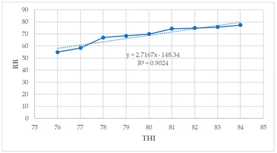 In this study, the lactating Holstein Friesian crossbred dairy cows respired significantly faster and panted relatively more frequently at higher THI values. These results differ from those obtained by Djelailia et al. [59], who reported 63 breaths/min at a THI of 80 for Holstein Friesian dairy cows reared in the Mediterranean climate of Tunisia. The increased rate of RR and PS is an indication that these animals are losing heat as an attempt to maintain homeothermy [27]. Respiration rates increase when the ambient temperature surpasses the dairy cow thermoneutral zone, which typically ranges from −5 °C to 25 °C, and declines again below this thermoneutral zone [61]. The increase in RR in lactating dairy cow is used to disperse around 30% of body heat by respiratory vaporization. This respiratory vaporization and convection dissipation of body heat help a lactating dairy cow to maintain its thermal balance [29]. The RR has been shown to be the first physiological response to an increased ambient temperature for lactating Holstein Friesian dairy cows in the late stages of lactation reared in the Netherlands [16,60].
