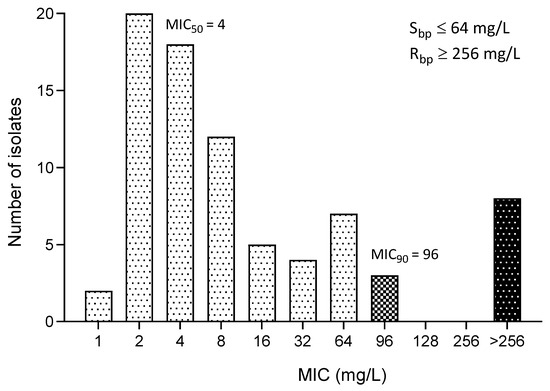 The MICs for various antibacterial drugs were measured for all E. coli samples: ampicillin (2–32 mg/L), amoxicillin/clavulanic acid (2/1–32/16 mg/L), piperacillin (4–128 mg/L), cephalexin (4–64 mg/L), cefpodoxime (0.25–8 mg/L), cefovecin (0.5–8 mg/L), ceftiofur (1–8 mg/L), imipenem (1–16 mg/L), amikacin (2–64 mg/L), gentamicin (1–16 mg/L), tobramycin (1–16 mg/L), enrofloxacin (0.12–4 mg/L), marbofloxacin (0.5–4 mg/L), tetracycline (1–16 mg/L), nitrofurantoin (16–512 mg/L), chloramphenicol (2–64 mg/L), and sulfamethoxazole/trimethoprim (20 (1/19)–320 (16/304) mg/L). These measurements were obtained using the VITEK® 2 system with Gram-negative Veterinary Susceptibility Test Cards (GN 65), following the manufacturer’s instructions (BioMérieux, Marcy L’Étoile, France). The MIC values for antibacterial drugs were interpreted based on their respective MIC breakpoints [25].