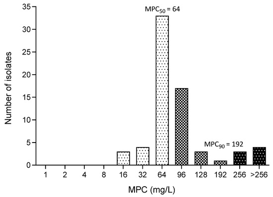 To determine the MPC values, 68 E. coli samples with MICs at or below the susceptible breakpoint (MIC ≤ 64 mg/L) were selected. Among these, 41.18% (n = 28) had MPCs exceeding the susceptible breakpoint. Although these samples initially showed high susceptibility to fosfomycin based on low MIC values, an increased bacterial population allowed mutations to occur, leading to heteroresistance and the emergence of resistant mutants under selective pressure from antibacterial drugs.