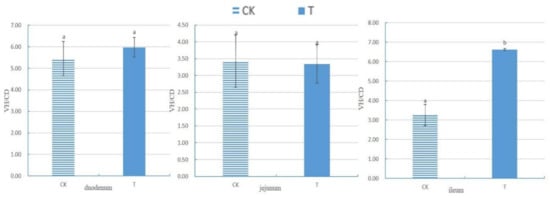 The ratio of small intestine villus height to crypt depth of chickens with (T) and without (CK) Sphingomonas Z392 in drinking water. Note: the same letter in the same column indicates no significant difference (p > 0.05) and the absence of identical letters indicates significant differences (p < 0.05).
