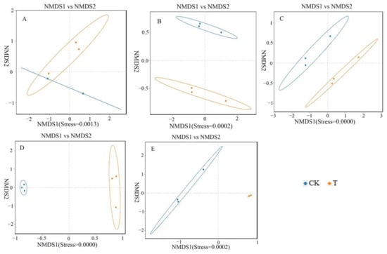 Non-metric multidimensional scale (NMDS) analysis of different intestinal segments from different groups of chickens with (T) and without (CK) Sphingomonas Z392 in drinking water. Note: 1. (A–E) show the results of the non-metric multidimensional scale analysis of the duodenum, empty field, ileum, cecum, and rectum, respectively. 2. The appearance of an obvious cross indicates that there is no significant difference in microbial structure and composition between groups, while the absence of a cross indicates significant differences in microbial structure and composition between groups. 3. Each point in the figure represents a sample; different colors represent different groups; the elliptical circle represents a 95% confidence ellipse (i.e., if there are 100 samples in the sample group, 95 will fall within it). When the stress is less than 0.1, it can be considered a good sorting and when the stress is less than 0.05, it has good representativeness. It is generally believed that, when the stress is less than 0.2, it indicates that the NMDS analysis has a certain level of reliability. The closer the samples on the coordinate map, the higher the similarity.