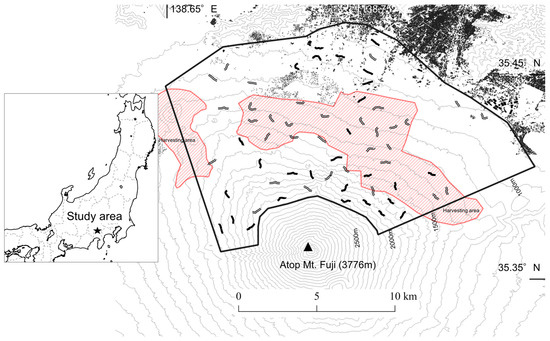 The Mount Fuji study area (black frame border) with all belt transect locations (single and double lines). Double lines indicate a sika deer Cervus nippon pellet group density of less than five (pellet group number/100 m), whereas single lines indicate a density of five or more (pellet group number/100 m). Areas in red with diagonal lines indicate harvesting areas, whereas white parts indicate non-harvesting areas. Black polygons indicate human residential areas.