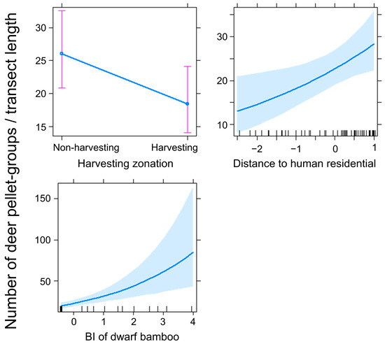 We found fresh sika deer pellet groups in all 60 transects (100%), counting 1986 pellet groups (Supplementary Materials Table S1). The mean ± SD pellet group number per 100 m was 6.0 ± 6.2 (range, 0.2–38.3). Model selection to identify the appropriate model structure for the number of deer pellet groups revealed that the best model included the harvesting zonation, distance to nearest human residential area, and BI of dwarf bamboos (Table 1). The best-fit model showed the following patterns: deer selected areas with non-harvesting areas (β = −0.36, SE = 0.18, z = −2.05, p < 0.05), far from human residential areas (β = 0.23, SE = 0.09, z = 2.56, p < 0.05), and higher dwarf bamboo abundance (β = 0.34, SE = 0.09, z = 3.95, p < 0.001, Figure 2).