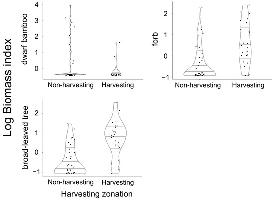 Violin plots representing the summer forage abundances of dwarf bamboos, deciduous broad-leaved trees, and forbs for sika deer Cervus nippon in non-harvesting areas (n = 36) and harvesting areas (n = 24) at Mount Fuji, central Japan. Points and lines inside the violin show raw data and those variations (median, range, and 25th–75th percentiles), respectively. Biomass index (BI) of deciduous broad-leaved trees were transformed into natural logarithms.