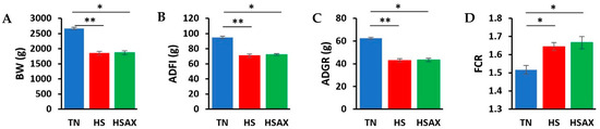 Growth performance indicators of Cobb 500 broilers. Three groups were compared: TN, HS, and HSAX. Dunn post hoc test for pair-wise comparison of statistical significance represented: (A) BW (g), TN vs. HS (p = 0.010); TN vs. HSAX (p = 0.028); (B) ADFI (g), TN vs. HS (p = 0.005); TN vs. HSAX (p = 0.050); (C) ADG (g), TN vs. HS (p = 0.010); TN vs. HSAX (p = 0.0278); and (D) FCR, TN vs. HS (p = 0.023); TN vs. HSAX (p = 0.012). * Differences between treatments significant at p < 0.05; ** differences between treatments significant at p < 0.01.