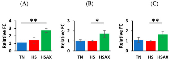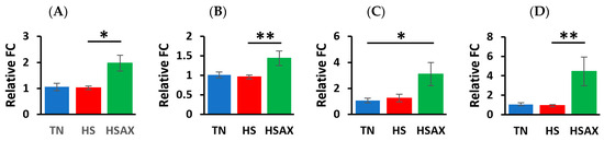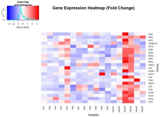 Performing the post hoc pairwise comparisons using Dunn’s test and applying the Bonferroni correction, the studies showed the impact of HS and AOX treatment expressed through the cytoprotective capacity genes, which resulted in the HSAX treatment group upregulating higher than the HS group in HSF2 (p = 0.017), SOD2 (p = 0.002), and TXN (p = 0.052) (Table 4, Figure 3). The HSAX group was found to be upregulated higher than the TN group in GPX3 (p = 0.033). The results indicate the AOX treatment appears to increase cytoprotective capacity.