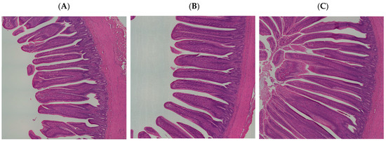 A section of the ileum was placed in a scintillating vial with 10% neutral buffered formalin (NBF) and stored at ambient temperature in preparation for Hematoxylin and Eosin (H&E) staining slides. Cross-sectional pieces of ileum were also prepared and fixed overnight in 4% paraformaldehyde (PFA), then incubated in a 15% sucrose solution for 3 h, embedded in optimal cutting temperature (OCT) compound, and stored at −80 °C. The ileum tissues were sectioned at 6 μm thickness, stained with H&E, and mounted to slides at the Histology Core Facility at the John A. Burns School of Medicine, University of Hawaii at Manoa. Slides were observed under both 5× and 20× objective lenses, and images were captured on a Leica Thunder microscope (Danaher, Chicago, IL, USA). The criterion for villus selection was based on the presence of intact lamina propria, and fifteen villi were assessed per sample. Villus height (VH) was measured from the tip of the villus to the crypt, crypt depth (CD) from the villus base to the submucosa, villus surface area (VSA) calculated as the villus base width plus the villus apical width divided by two, and the ratio of villus height to crypt depth (VH/CD) [7,8,37]. The measurements were recorded using Image J Fiji software ver 1.54i [38].