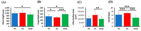 The VH of the HSAX measured significantly less than TN. This appears to be the result of physiological changes, shortening the villi and altering the epithelial cell and morphology, which may be an adaptive mechanism to preserve intestinal function and optimize nutrient absorption [19,23,38].