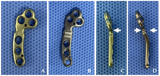 To mitigate these risks, modified TPLO surgical techniques have been developed to reduce costs and minimize the risks associated with anesthesia in multiple procedures [12,14,15,19,20,21]. This modification involves adapting the standard TPLO plate to enable medial shifting fixation of the proximal tibia, potentially combining the benefits of both TPLO and TTT procedures [12,14,15,22]. However, the process of contouring the plate during surgery may prolong operation time and result in varied outcomes depending on the surgeon’s experience [14]. To address these challenges, several pre-contoured plates and patient-specific implants using 3D printing techniques have been specifically developed for small-breed dogs [9]. During the TPLO procedure, the application of a pre-contoured plate post-osteotomy facilitates medial shifting of the proximal segment, effectively replicating the outcomes of TTT [20]. A novel design of a pre-contoured TPLO plate, angled medially by 2 mm, has been introduced for small-breed dogs, offering advantages such as reduced operation time and increased consistency between surgeons [20]. Despite these advantages, there is currently no confirmation regarding whether contouring affects plate stability and provides adequate medialization in small-breed dogs [12,14].