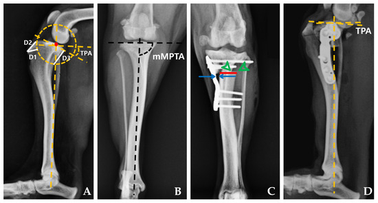Mediolateral and craniocaudal radiographs were obtained to assess the osteotomy site and identify any anatomical deformities (Figure 2). The same surgical planning approach was maintained for both groups throughout the study by a surgeon (E.B.J). The tibial plateau angle (TPA) was measured in the mediolateral view, following the method described by Slocum and Devine [25], while the mechanical medial proximal tibial angle (mMPTA) was measured in the craniocaudal view using the approach described by Dismukes et al. [26,27]. Specific measurements denoted as D1, D2, and D3 were taken to determine the osteotomy site using the standard method previously described [20].