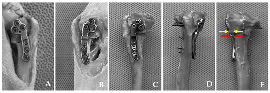 Intraoperative images illustrating the attachment of the TPLO plate (A) and the pre-contoured modified (PCM) TPLO plate (B) to the tibia. Measurements of the dissected tibiae of the PCM–TPLO groups (C–E). Medial, anterior, and posterior views after removal of soft tissues and the fibula attached to the tibia (C–E). The extent of medial translation of the proximal segment was measured using calipers (yellow arrows), while the gaps between the bone and plate were measured (red arrows).