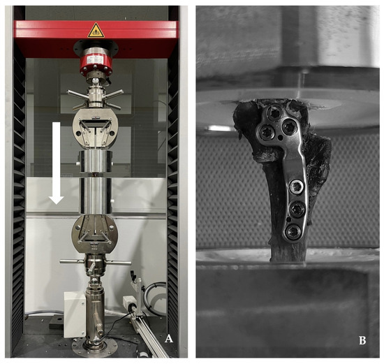 Photograph of the compression test. Mechanical testing stainless-steel jig affixed to the servo-hydraulic testing machine. A 3D resin jig is firmly positioned within a stainless-steel jig, and a compressive load is applied vertically downward (A). The tibia with the TPLO plate is securely fastened to the proximal and distal 3D resin jigs, ensuring that neither the plate nor the screws are embedded in plaster (B).