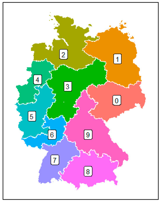 Overview of Germany, with areas classified based on the first digit of the zip code.