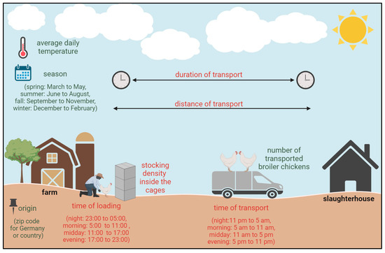In 2022, about 631 million broilers were slaughtered in Germany, and the preliminary data for 2023 indicate a similar level [1]. It can be assumed that approximately the same number of animals were transported to the slaughterhouse in both years. The transport of animals is regulated in accordance with European Union (Council Directive (EC) 1/2005) and national law (Animal Welfare Transport Ordinance—TierSchTrV, 2009) [2,3]. These regulations deal with requirements concerning the stocking density and duration of transport and the conditions of transportation cages, for instance. It is known that the catching and loading of the animals for transport, and also the transport itself, may cause stress for the animals [4,5]. The amount of dead animals (dead on arrival, DOA) is used as a first indication to identify pre-slaughter welfare issues [6].