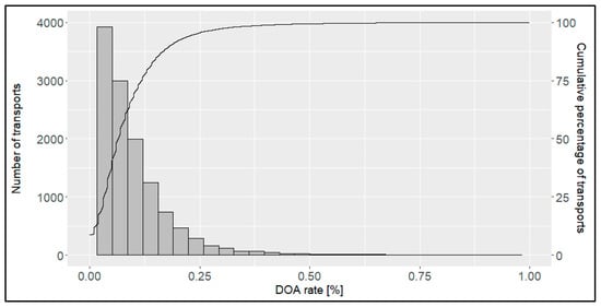 Number of transports (bars) and cumulative percentage (line) of transports per dead-on-arrival (DOA) rate [%]) (n = 14,054 broiler transports).