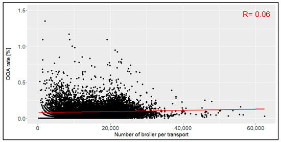 Relation between the number of broilers per transport unit and the dead-on-arrival (DOA) rate [%], including the correlation coefficient (R) (n = 14,054 broiler transports).