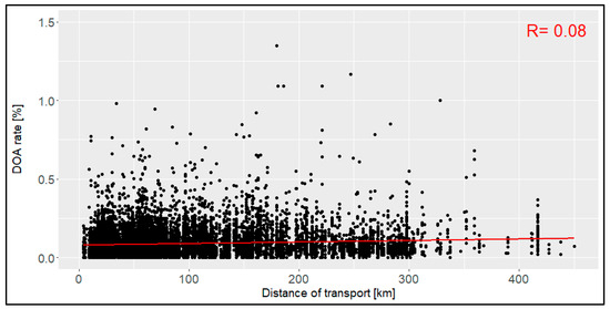 Relation between the distance of the transport [km] and the dead-on-arrival (DOA) rate [%], including the correlation coefficient (R) (n = 14,054 broiler transports).