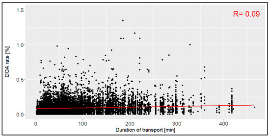 Relation between the duration of the transport [min] and the dead-on-arrival (DOA) rate [%], including the correlation coefficient (R) (n = 14,054 broiler transports).