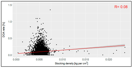 Relation between the stocking density [kg per cm2] and the dead-on-arrival (DOA) rate [%], including the correlation coefficient (R) (n = 11,966 broiler transports).