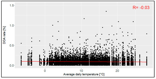 The average daily temperature in Northern Germany for all the transports differed from -6.6 °C to 28.1 °C, showing a mean value of 11.0 °C (Figure 8). The confidence interval ranged from -1.8 °C to 24.3 °C. The correlation was 0.03, indicating that there was no relation between the average daily temperature in Northern Germany and the DOA rate. Transports below 0 °C (3.4% of all the transports) and above 25 °C (0.8% of all the transports) were rare.