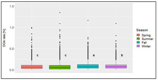 Boxplots of the dead-on-arrival (DOA) rate [%] per season; significant differences (p < 0.05) are marked with different letters (n = 14,054 broiler transports).